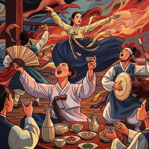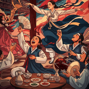 따라서 '음주가무'의 사전적 의미는 '술을 마시고 노래하고 춤을 춤'입니다. 이 네 가지 행위는 고대 한국의 제천 의식이나 마을 축제에서부터 시작되어, 즐거움과 흥을 표현하는 기본적인 수단으로 자리 잡았습니다. 특히 한국의 전통적인 문화에서는 흥(興)을 외적으로 표출하는 것을 중요하게 여겼기 때문에, 이 네 가지 행위의 결합은 단순한 소비적 유흥이 아닌, '함께 즐기고 스트레스를 해소하며 공동체적 연대감을 높이는 문화적 활동'의 의미를 가졌습니다.